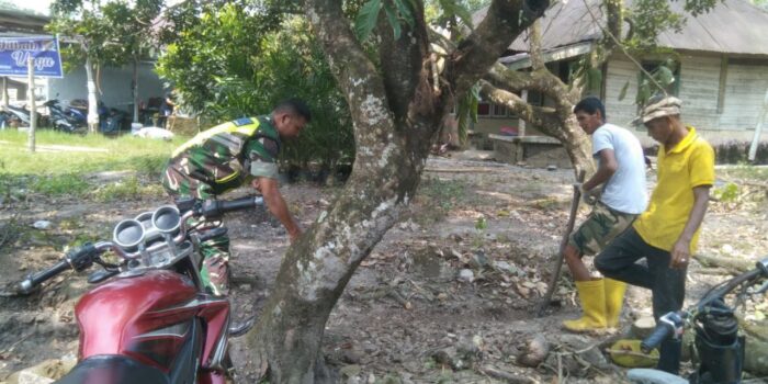 Babinsa Desa Pulau Panjang Hilir Turun Tangan Bantu Pembangunan Pagar Beton Warga