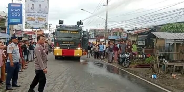 LensaKita.co.id — Mobil Armoured Water Cannon (AWC) Polres Pasaman Barat (Pasbar) dikerahkan untuk membantu petugas pemadam memadamkan Sijago merah yang mengamuk di