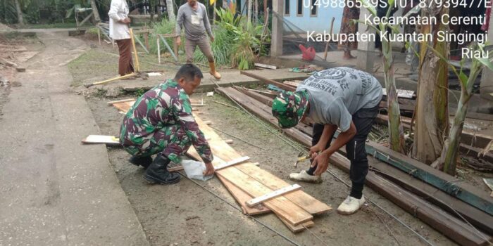LensaKita.co.id — Menciptakan Sinergitas TNI bersama rakyat, Babinsa Koramil 06/Cerenti Kodim 0302/Inhu Koptu Junedi membantu warga membangun rumah millik salah satu warga