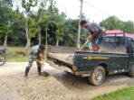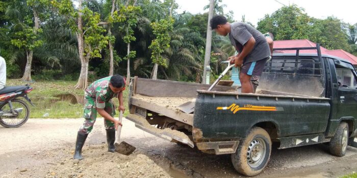 LensaKita.co.id — Babinsa Koramil 06/Cerenti Kodim 0302/Inhu Pratu Teguh Mulya melaksanakan gotong royong bersama warga memperbaiki jalan yang rusak di Desa Kampung