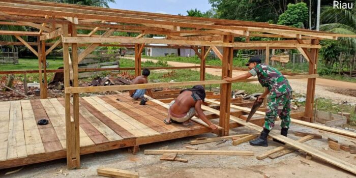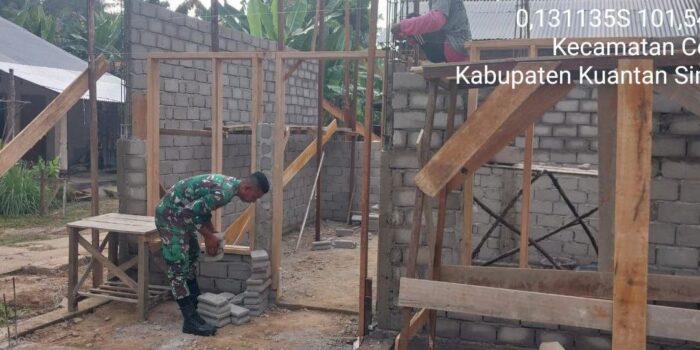 LensaKita.co.id — Menciptakan Sinergitas TNI bersama rakyat, Babinsa Koramil 06/Cerenti Kodim 0302/Inhu Pratu Reki Gunawan membantu warga membangun rumah milik salah satu
