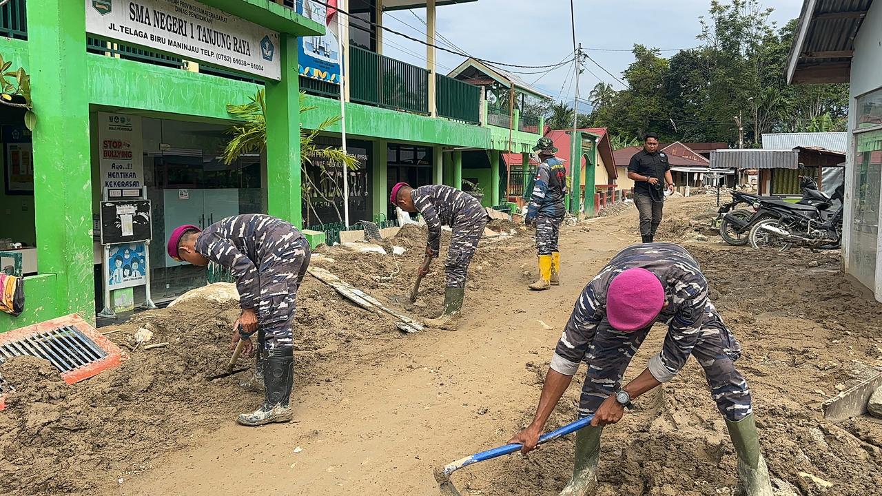 Para prajurit dengan semangat tinggi mencoba membersihkan sisa sisa lumpur dan material lainnya di SMA 1 Tanjung Raya Kecamatan Maninjau Kabupaten Agam, Kegiatan ini dilaksanakan pada hari Sabtu (3/1/2026).
