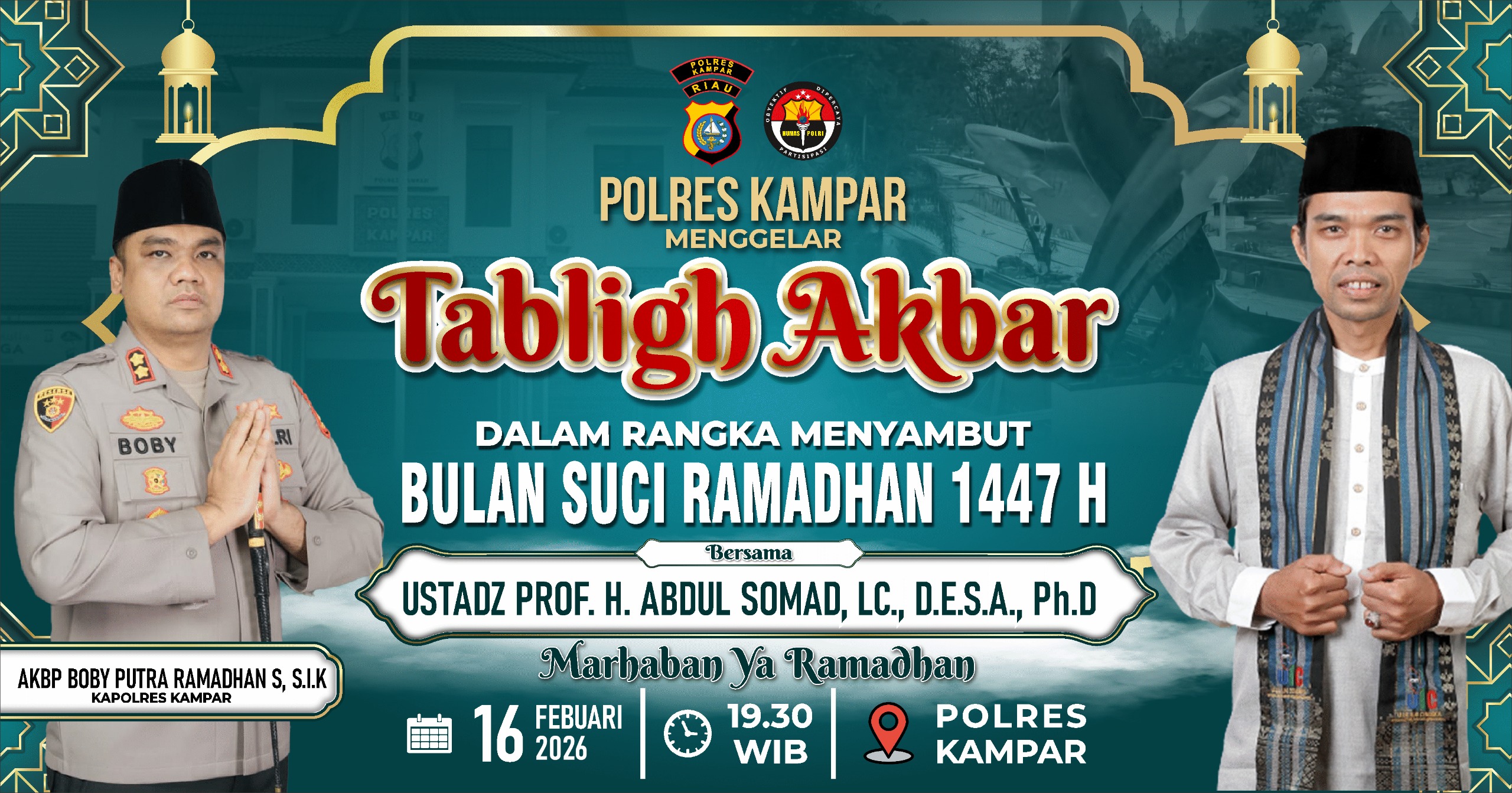 LensaKita.co.id — Polres Kampar mengajak seluruh masyarakat untuk menyambut bulan suci Ramadan 1447 Hijriah dengan hati yang bersih dan niat yang lurus melalui kegiatan Tabligh Akbar yang akan digelar di Lapangan Mapolres Kampar, kabupaten, Kampar, Propinsi Riau,Pada Senin (16/02/2026) pukul 19.30 WIB.