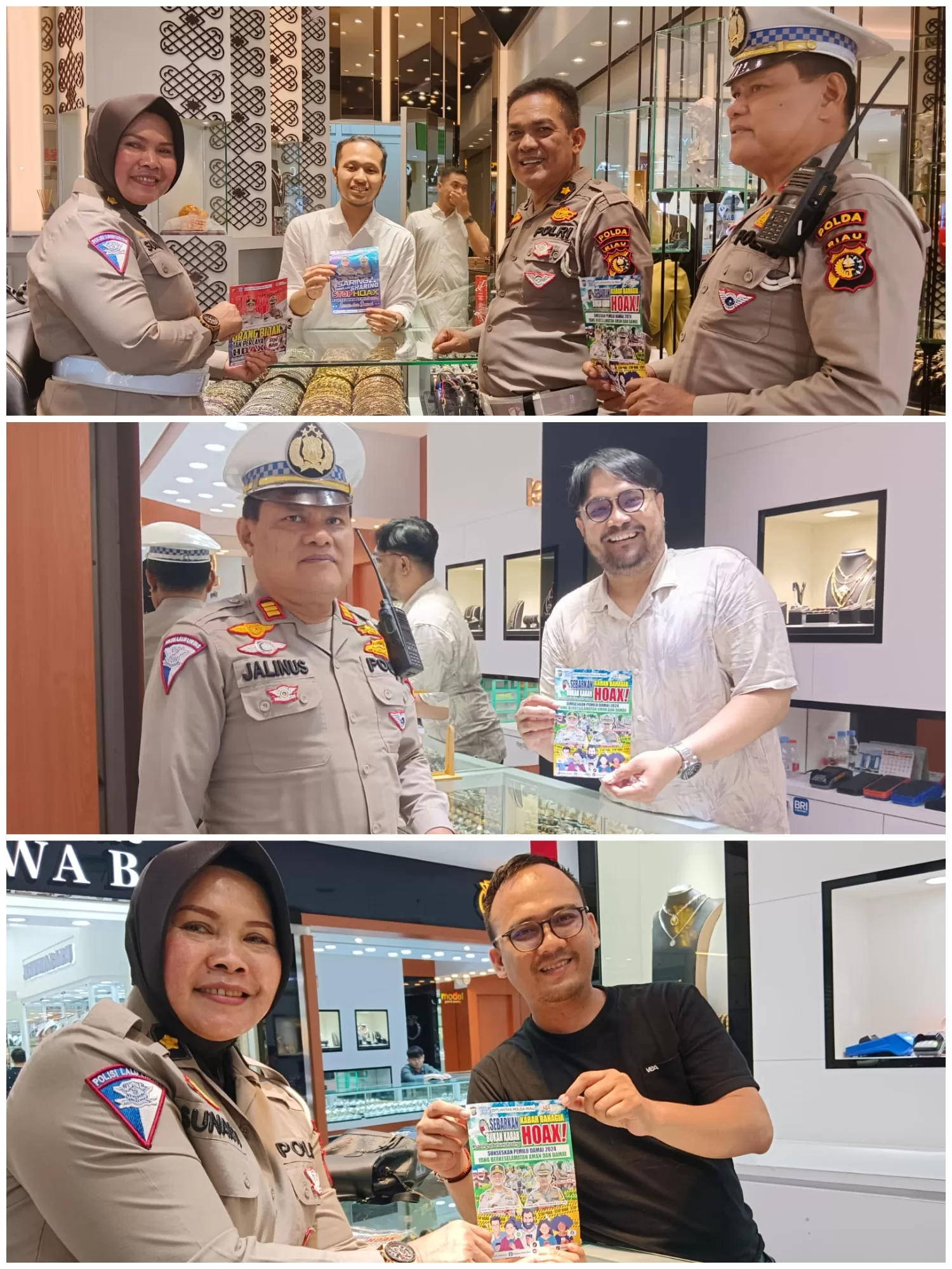 “Subditkamsel Ditlantas Polda Riau hari ini melaksanakan patroli dialogis di toko-toko perhiasan di Sukaramai Trade Center Jalan Jendral Sudirman Pekanbaru, mengajak para pemilik toko dan pengunjung yang ada untuk menghindari hal-hal yang berpotensi mengganggu keamanan dan ketertiban, tidak mudah terpengaruh berita hoax, selalu saring informasi sebelum di sebarluaskan, dan turut serta mensukseskan Pemilu 2024”, tutur Taufiq kepada wartawan.