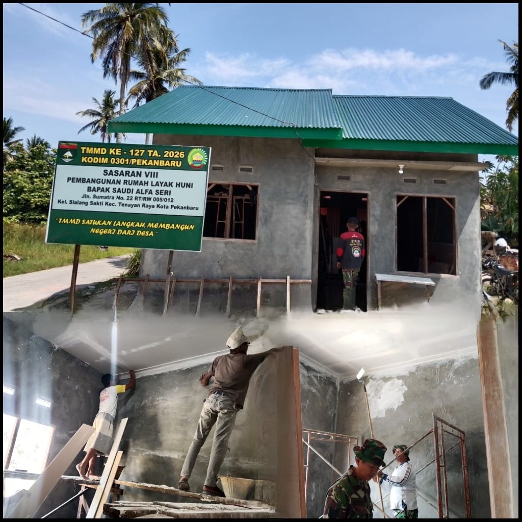 Lensakita.co.id, – Program TNI Manunggal Membangun Desa (TMMD) ke-127 yang dilaksanakan Satgas TMMD Kodim 0301/Pekanbaru terus menunjukkan progres signifikan. Kali ini, pembangunan Rumah Tidak Layak Huni (RTLH) milik Bapak Saudi Alfa Seri (45), warga Jalan Sumatra Nomor 22 RT/RW 005/012, Kelurahan Sialang Sakti, Kecamatan Tenayan Raya, Kota Pekanbaru, telah mencapai 83 persen, Senin (2/3/2026).