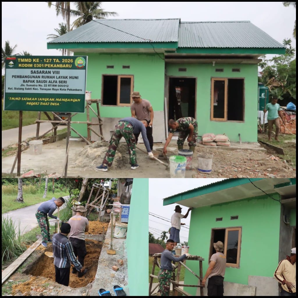 Lensakita.co.id, – Semangat pengabdian tanpa batas terus ditunjukkan oleh Satuan Tugas TNI Manunggal Membangun Desa (TMMD) ke-127 dari Kodim 0301/Pekanbaru. Di tengah pelaksanaan ibadah puasa, para personel Satgas tetap konsisten dan penuh dedikasi dalam menggesa pembangunan Rumah Tidak Layak Huni (RTLH) milik Bapak Saudi Alfa Seri (45), yang beralamat di Jalan Sumatra No. 22 RT/RW 005/012, Kelurahan Sialang Sakti, Kecamatan Tenayan Raya, Kota Pekanbaru. Kamis, 05 Maret 2026.