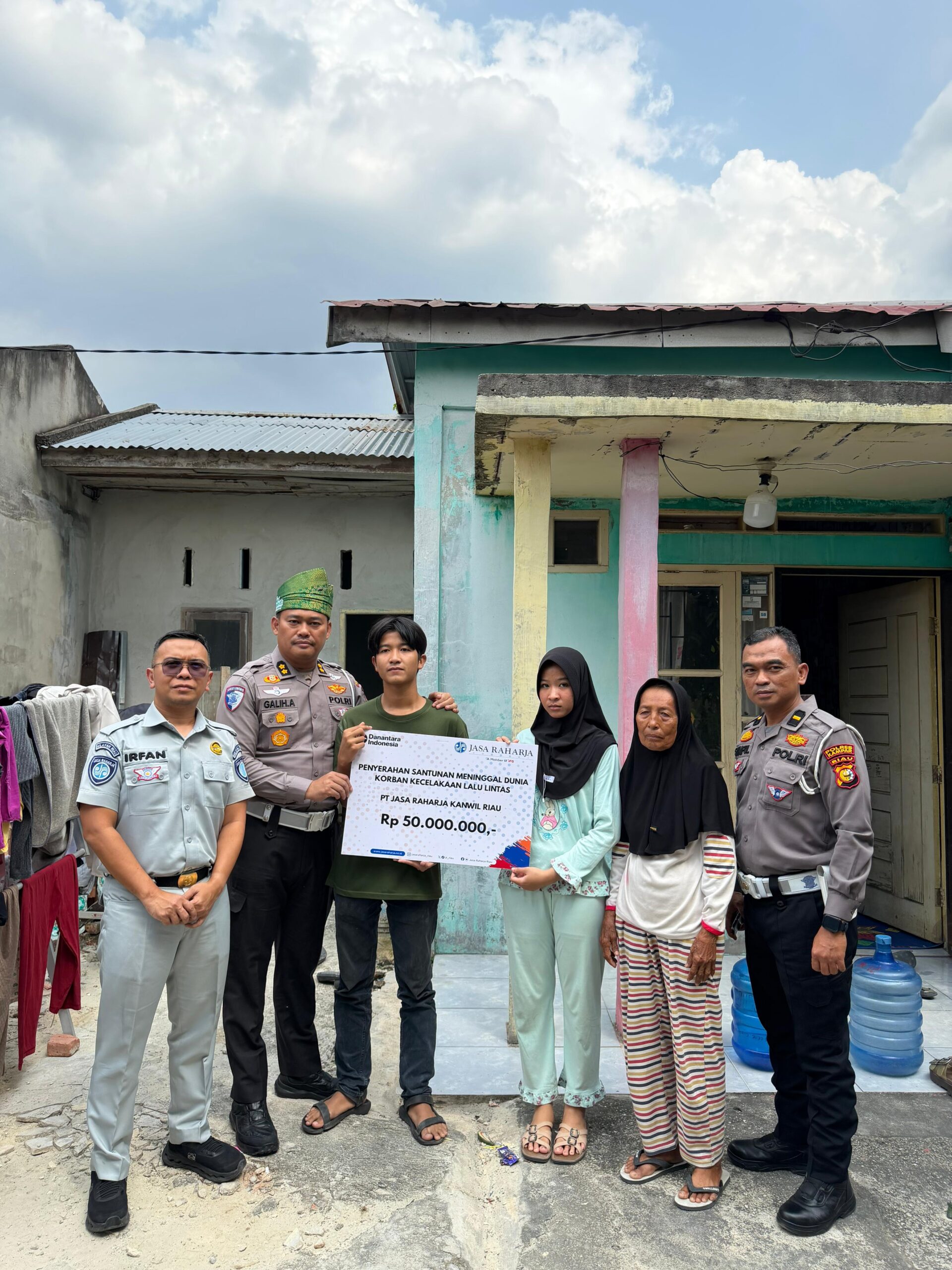 “Alhamdulillah hari ini kami dari Ditlantas Polda Riau bersama PT Jasa Raharja Riau secara langsung menyalurkan dana santunan asuransi jiwa kepada keluarga korban kecelakaan lalu lintas. Santunan ini diterima langsung oleh ibu almarhum serta anak-anaknya,” ujar AKBP Galih Apria.