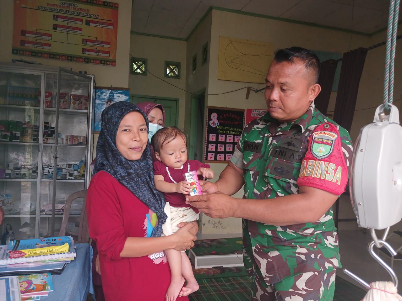 Babinsa dalam Komsos sebelumnya selalu mendampingi pelaksanaan posyandu, dalam hal ini Pelaksanaannya, dilakukan itu sudah bagus sekali meliputi penimbangan balita, pemberian makanan tambahan gizi dan vitamin. Untuk balita serta pemeriksaan Gigi pada anak dan pemeriksaan ibu hamil.