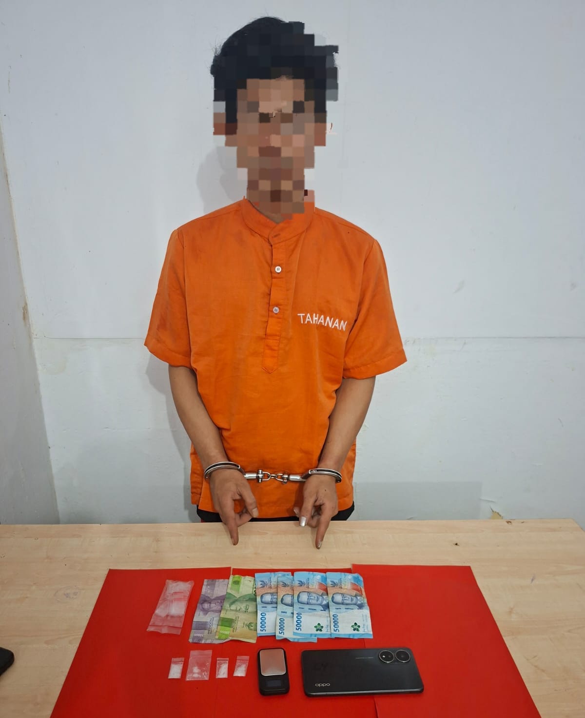 “Kemudian dilakukan penggeledahan badan dan tempat tinggal yang disaksikan oleh perangkat desa setempat, dan ditemukan 4 paket narkotika jenis shabu-shabu dengan berat bruto 1,27 gram, timbangan digital, unit handphone, serta uang tunai sebesar Rp230.000,”terangnya.