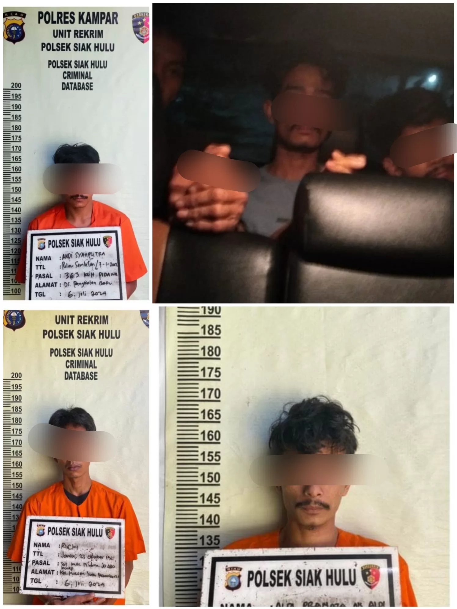 Setelah menangkap ketiganya Polsek Siak Hulu langsung melakukan mengintrogasi.Dari hasil Interogasi Tersangka mengaku sudah melakukan pencurian sepeda motor di depan Mesjid Raya Baitullah Desa Buluh Cina, dan sepeda motor tersebut berhasil di jual oleh Tersangka RICKY sebesar Rp 2.500.000 (Dua Juta Lima Ratus Ribu Rupiah), kepada seseorang yang tidak di kenal dengan sistem COD dan menunggu di Simpang SKA Pekanbaru
