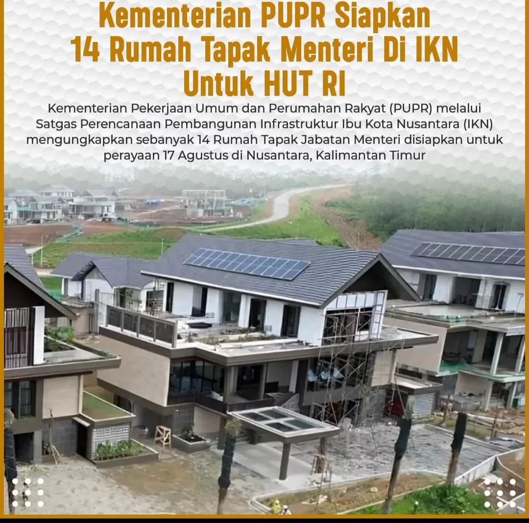 LensaKita.co.id — Kementerian Pekerjaan Umum dan Perumahan Rakyat (PUPR) melalui Satgas Perencanaan Pembangunan Infrastruktur Ibu Kota Nusantara (IKN) mengungkapkan sebanyak 14 Rumah Tapak Jabatan Menteri disiapkan untuk perayaan 17 Agustus di Nusantara, Kalimantan Timur.