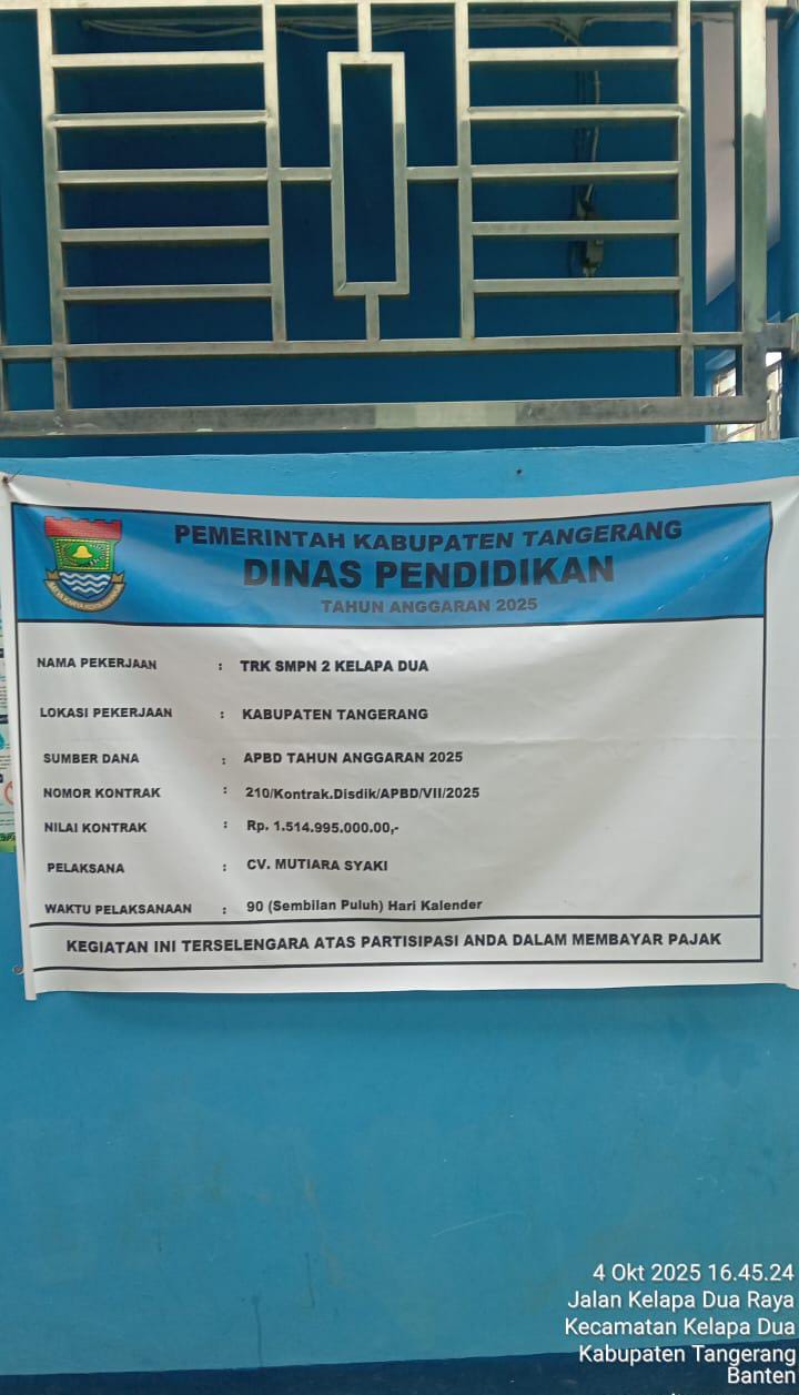 LensaKita.co.id -Pembangunan Tempat Ruangan Kelas (TRK) di SMPN 2 Kelapa Dua, Kabupaten Tangerang, yang menghabiskan anggaran sebesar Rp1.514.995.000,00 dari APBD 2025, harus terhenti di tengah jalan.